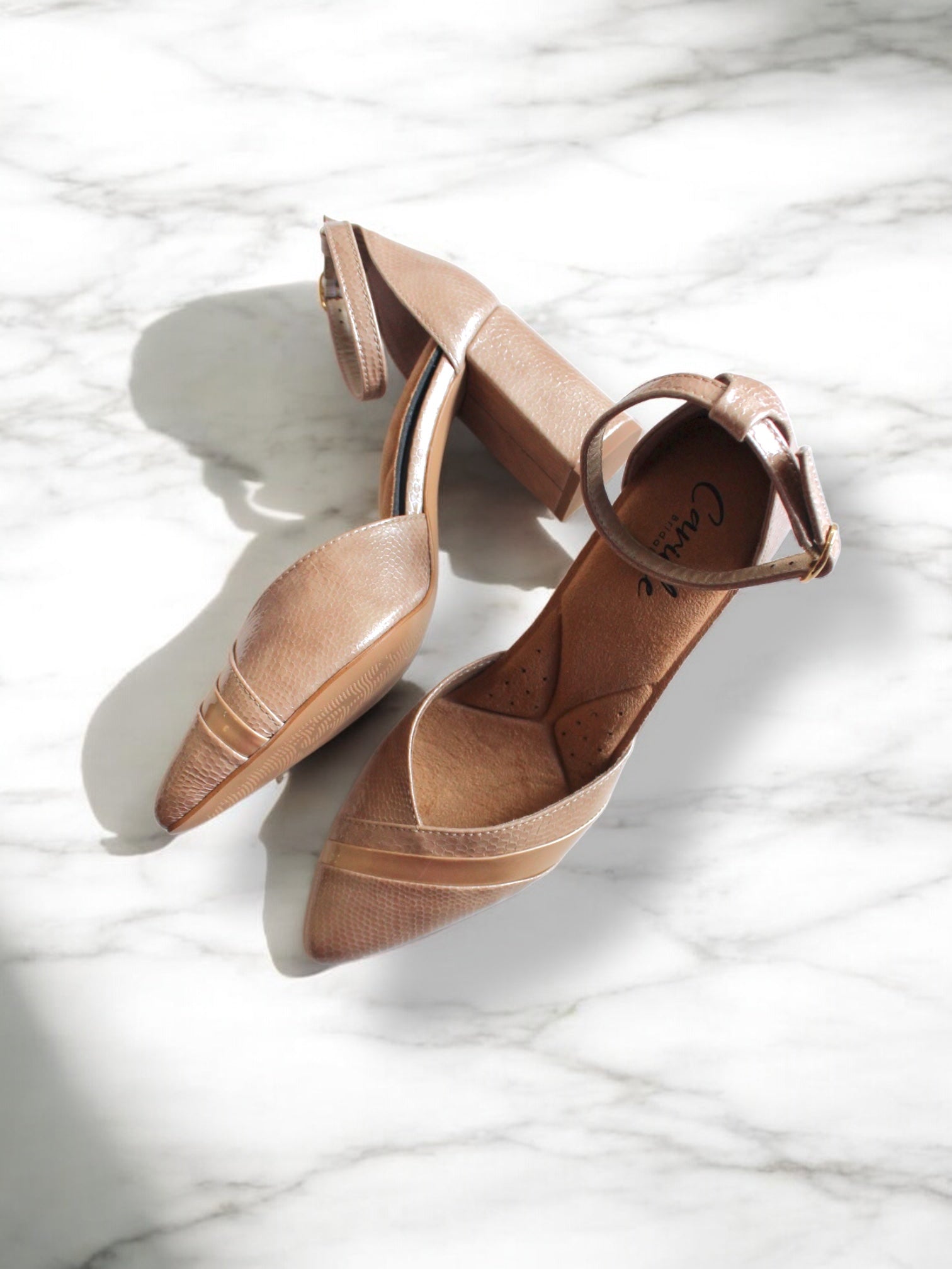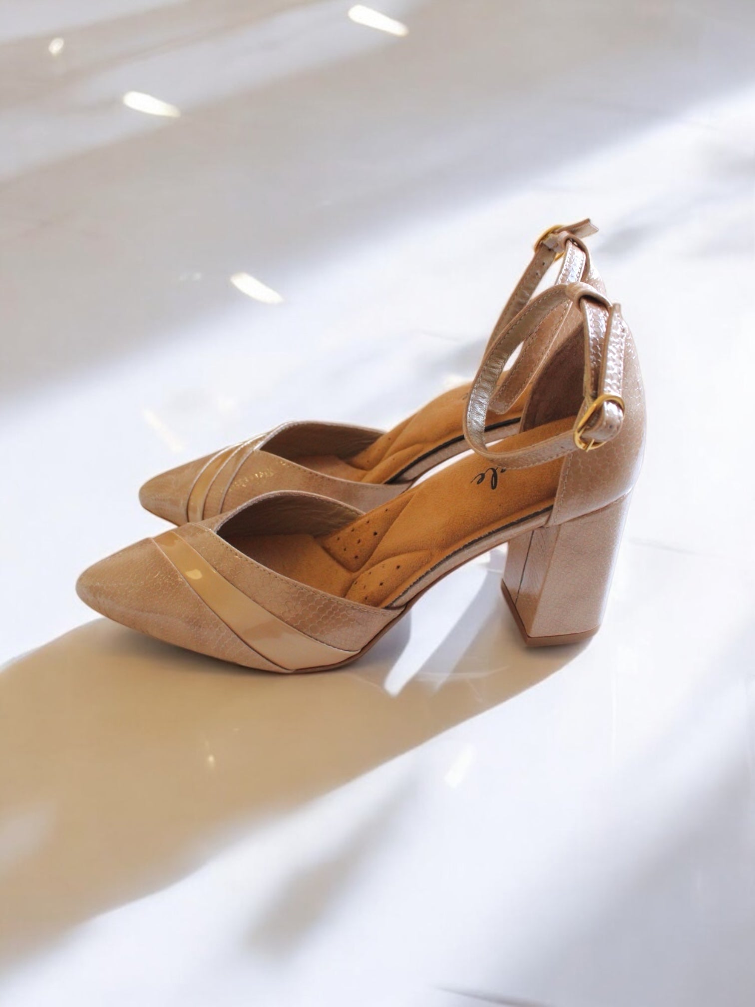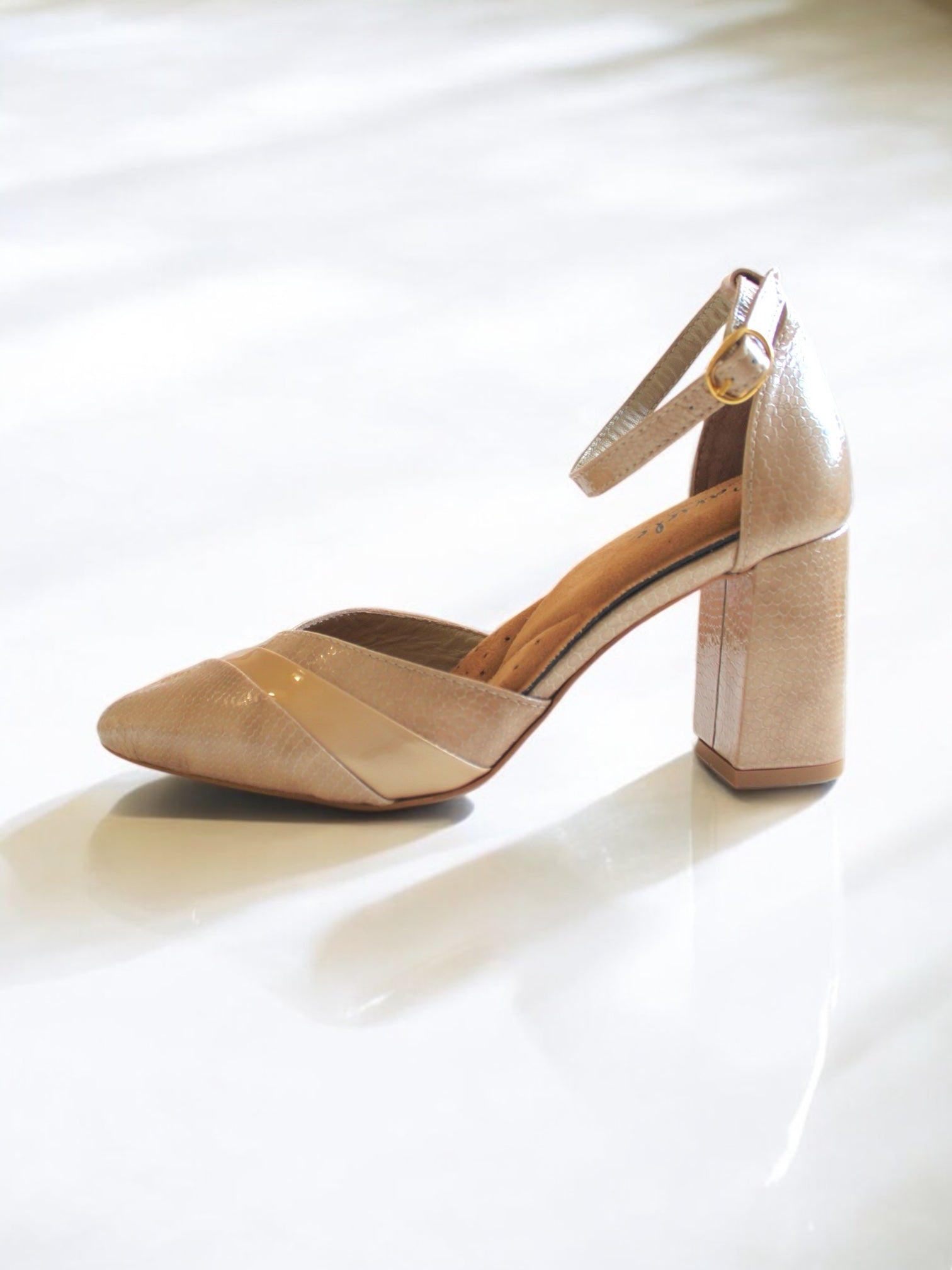 Las líneas suaves de la solapa alargan visualmente el pie, mientras que la correa ajustable en el tobillo con hebilla de metal dorado garantiza un ajuste seguro y elegante. Cada par está cuidadosamente elaborado por artesanos, dando como resultado un zapato único, diseñado con atención al detalle.