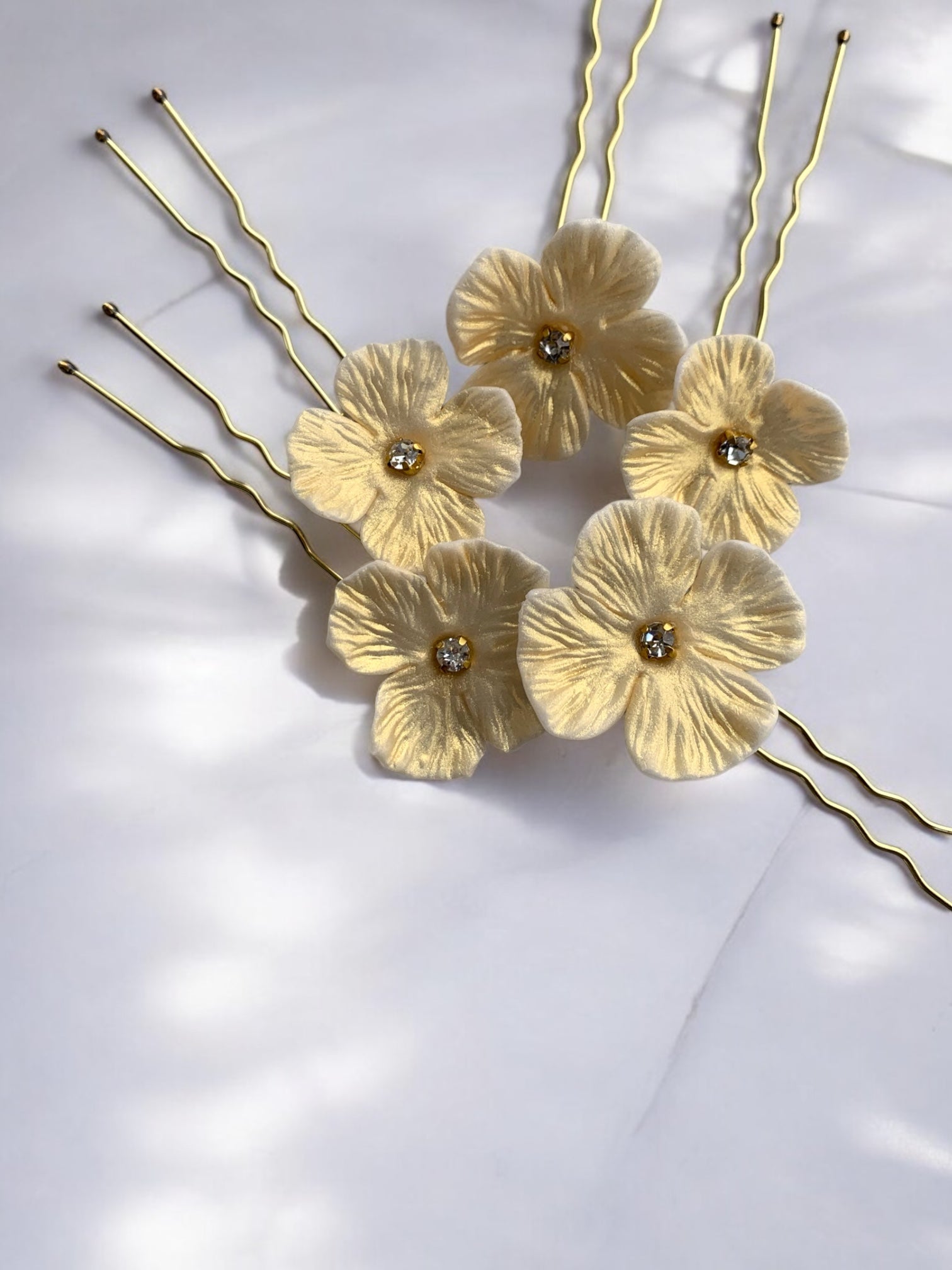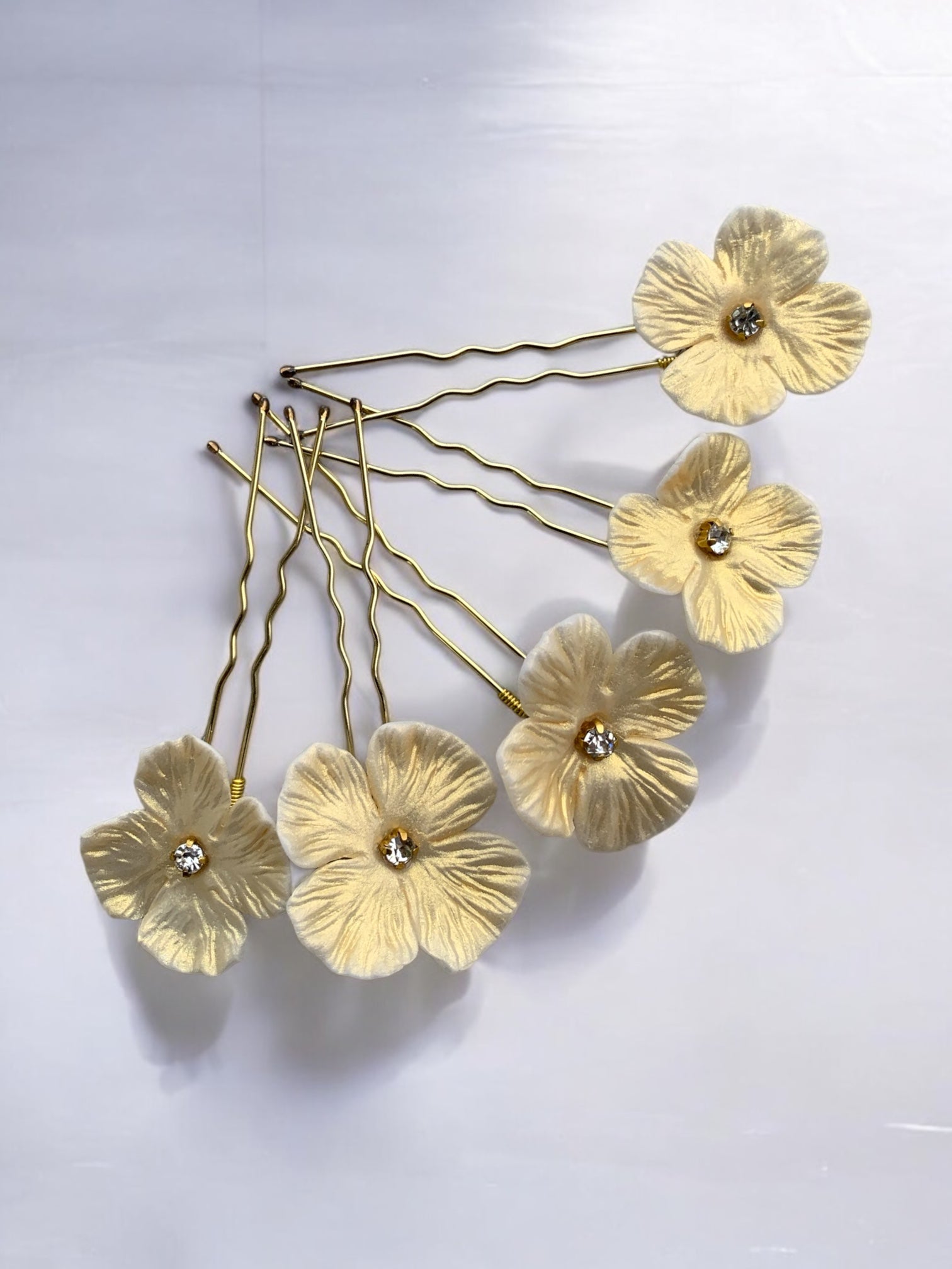 La delicadeza de la tradición en un detalle dorado. Este exclusivo juego de cinco horquillas está elaborado en cerámica japonesa , conocida por su extraordinaria ligereza y brillo satinado. Cada flor está moldeada y pintada individualmente en un sutil tono dorado, con un cristal brillante en el centro que capta la luz con cada movimiento.