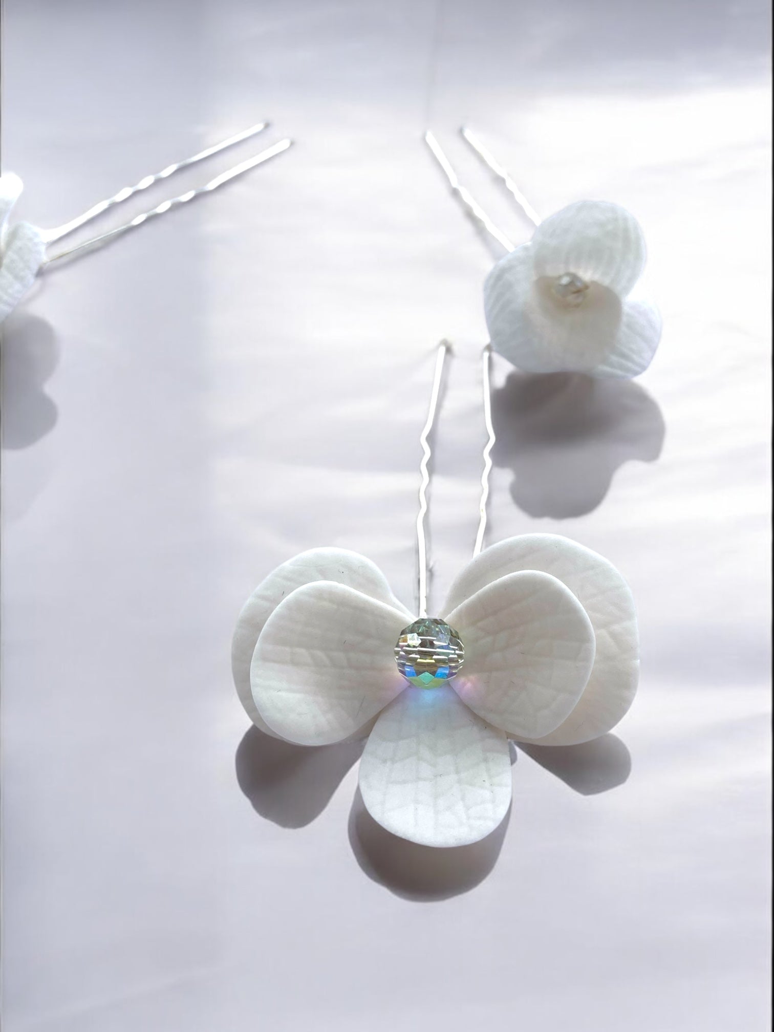 Realza tu peinado con la delicadeza atemporal de este conjunto de tres horquillas artesanales de alta joyería. Cada pieza es una oda a la naturaleza y al detalle, diseñada para novias, damas de honor o para ocasiones especiales que requieren un toque de luminosidad.