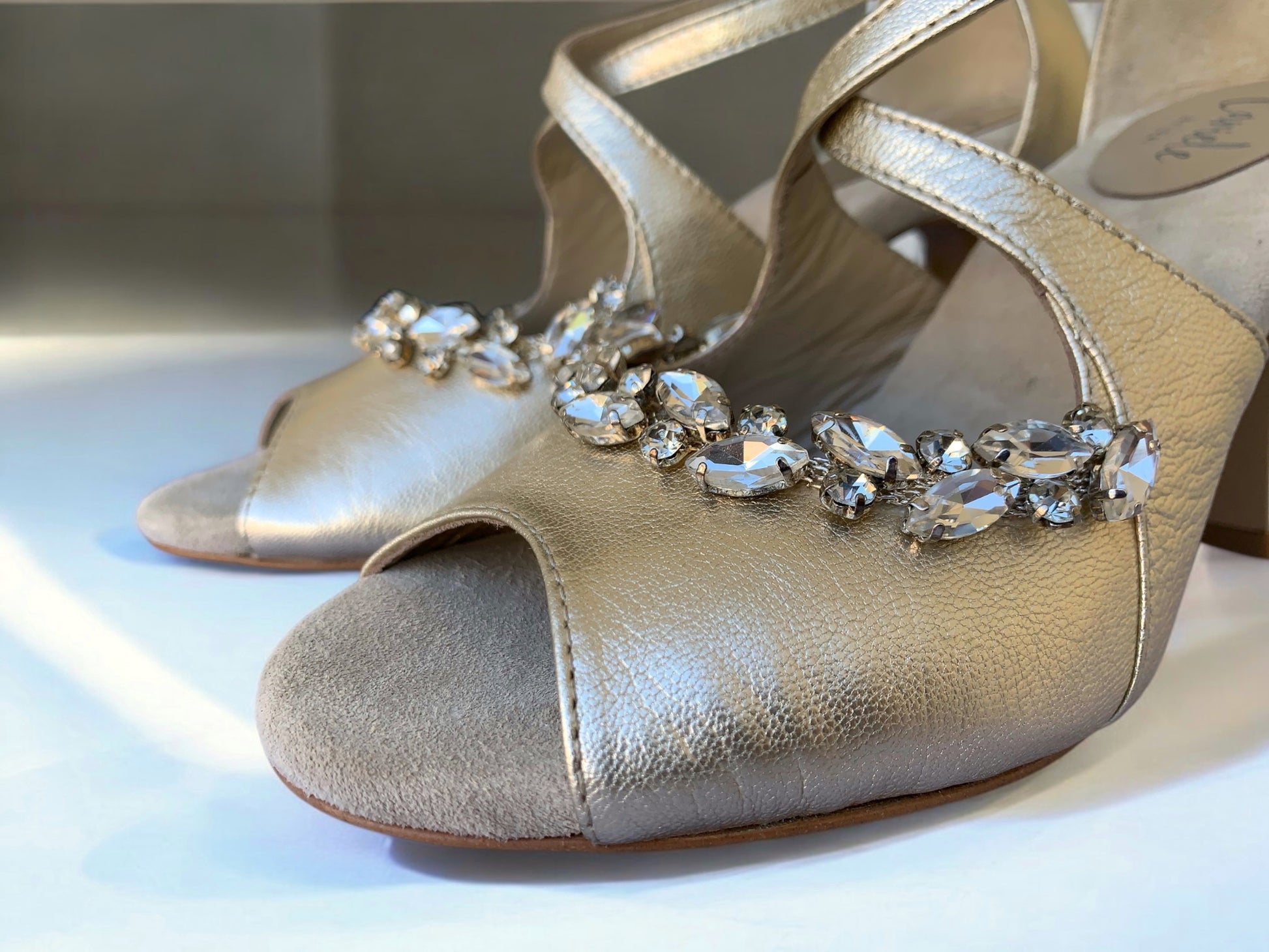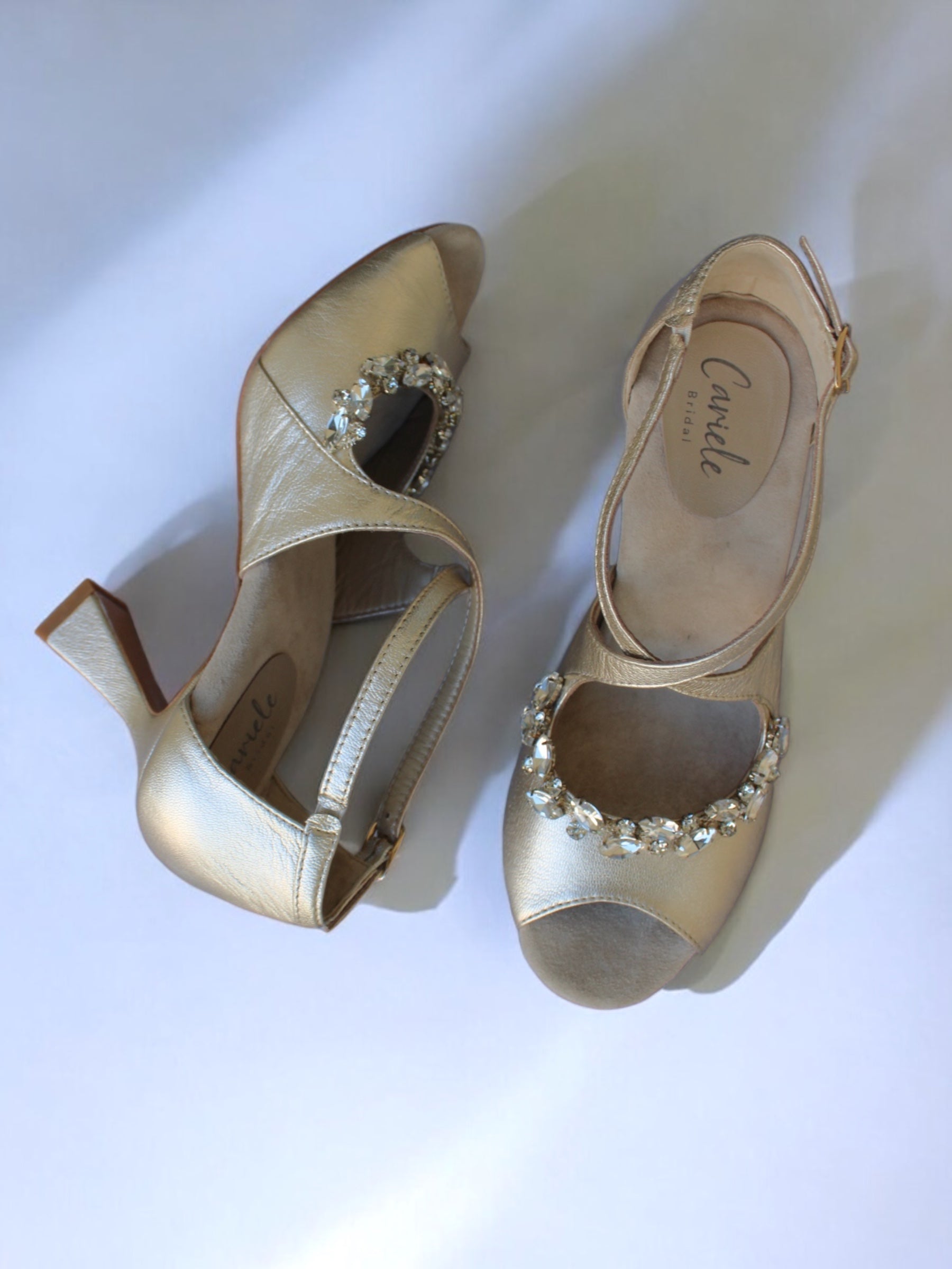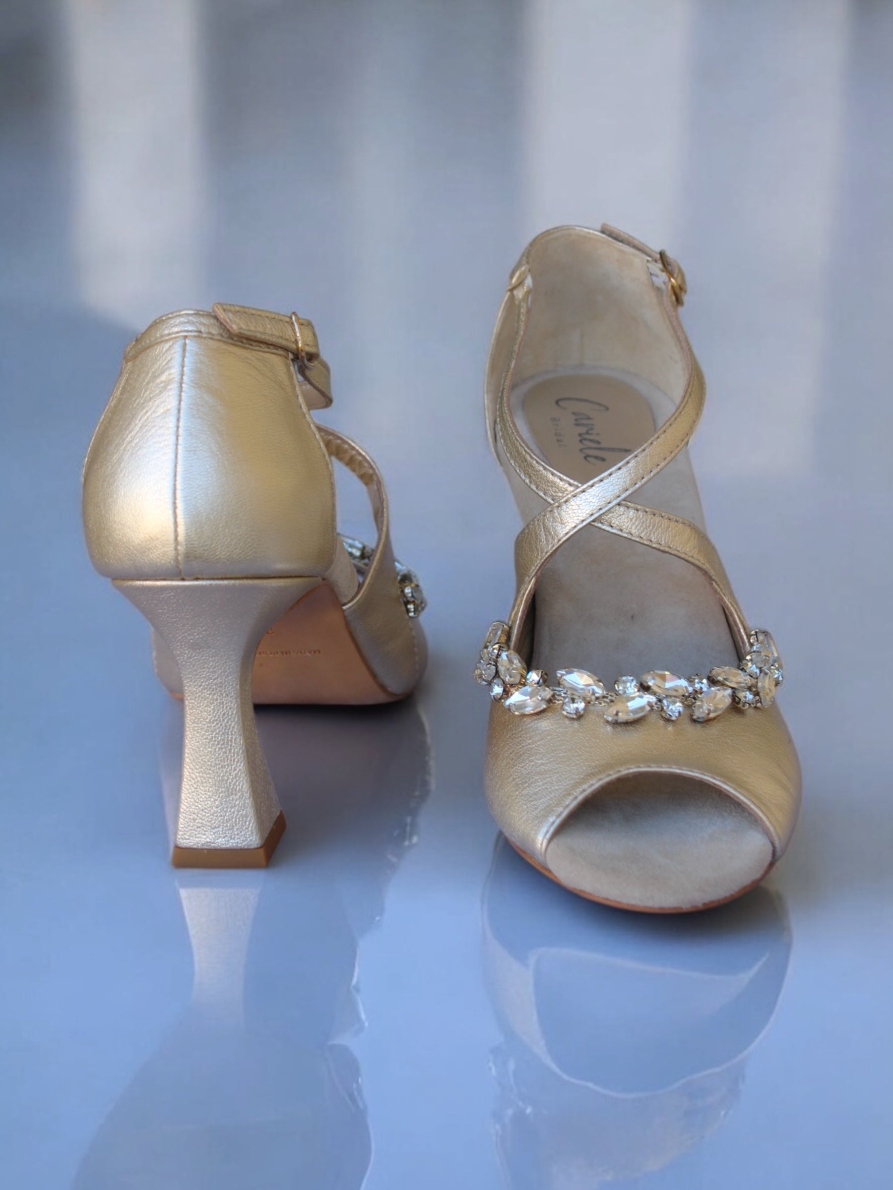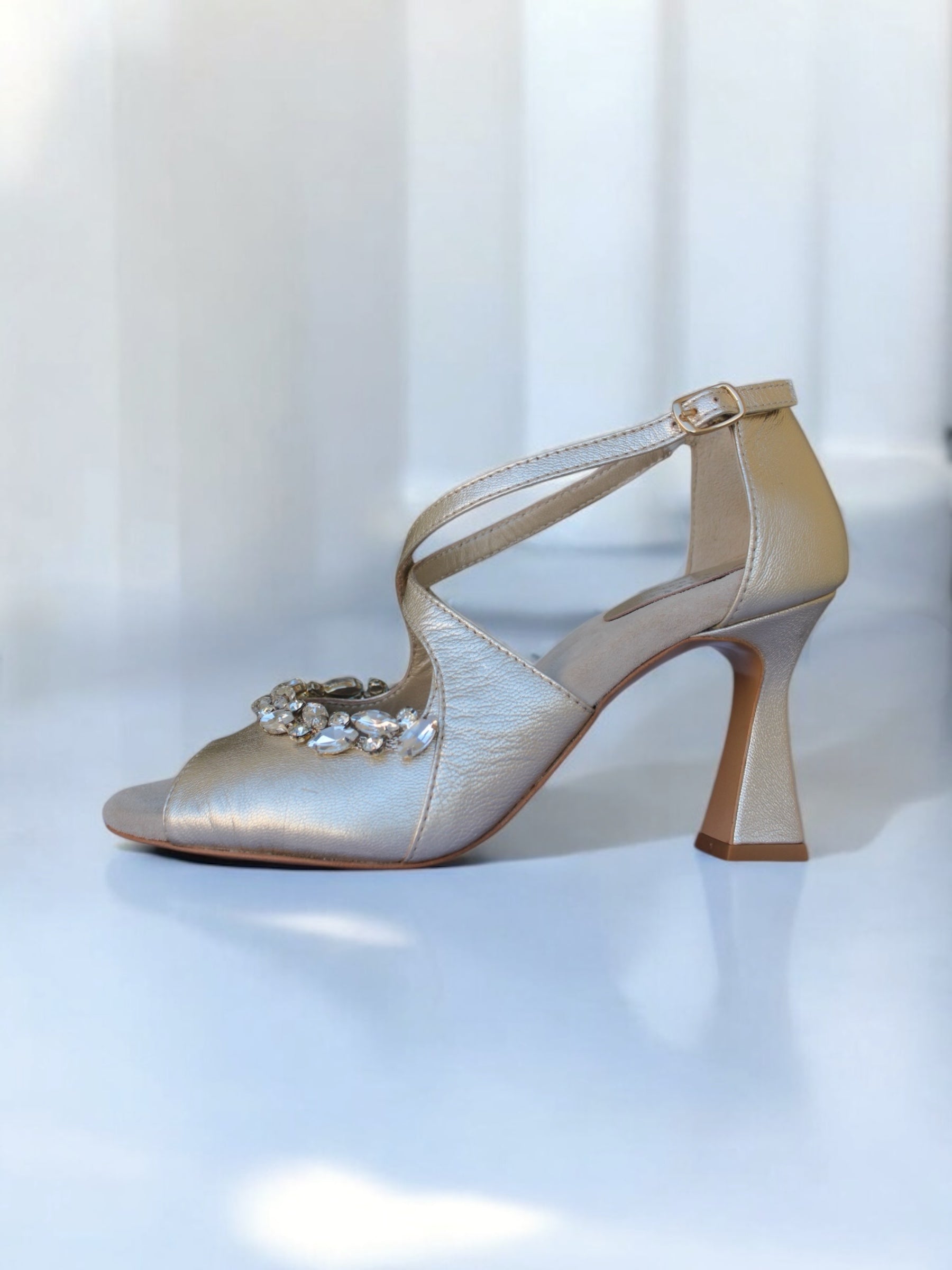 Confeccionado íntegramente en piel europea color oro champán, este zapato destaca por su fino acabado metalizado. Su diseño presenta tiras cruzadas que se ajustan elegantemente al pie y un tacón geométrico que garantiza estabilidad y un estilo moderno. El toque final de lujo reside en el bordado frontal de cristales facetados, aplicados a mano para reflejar la luz con cada paso.