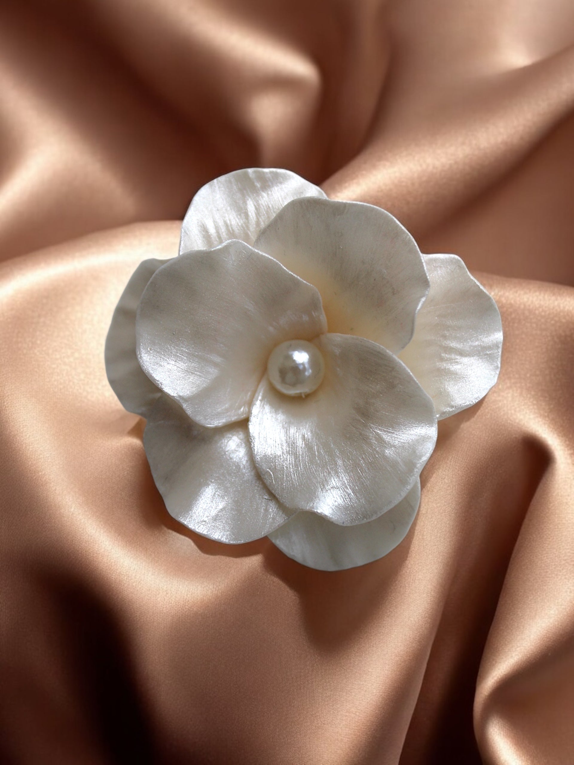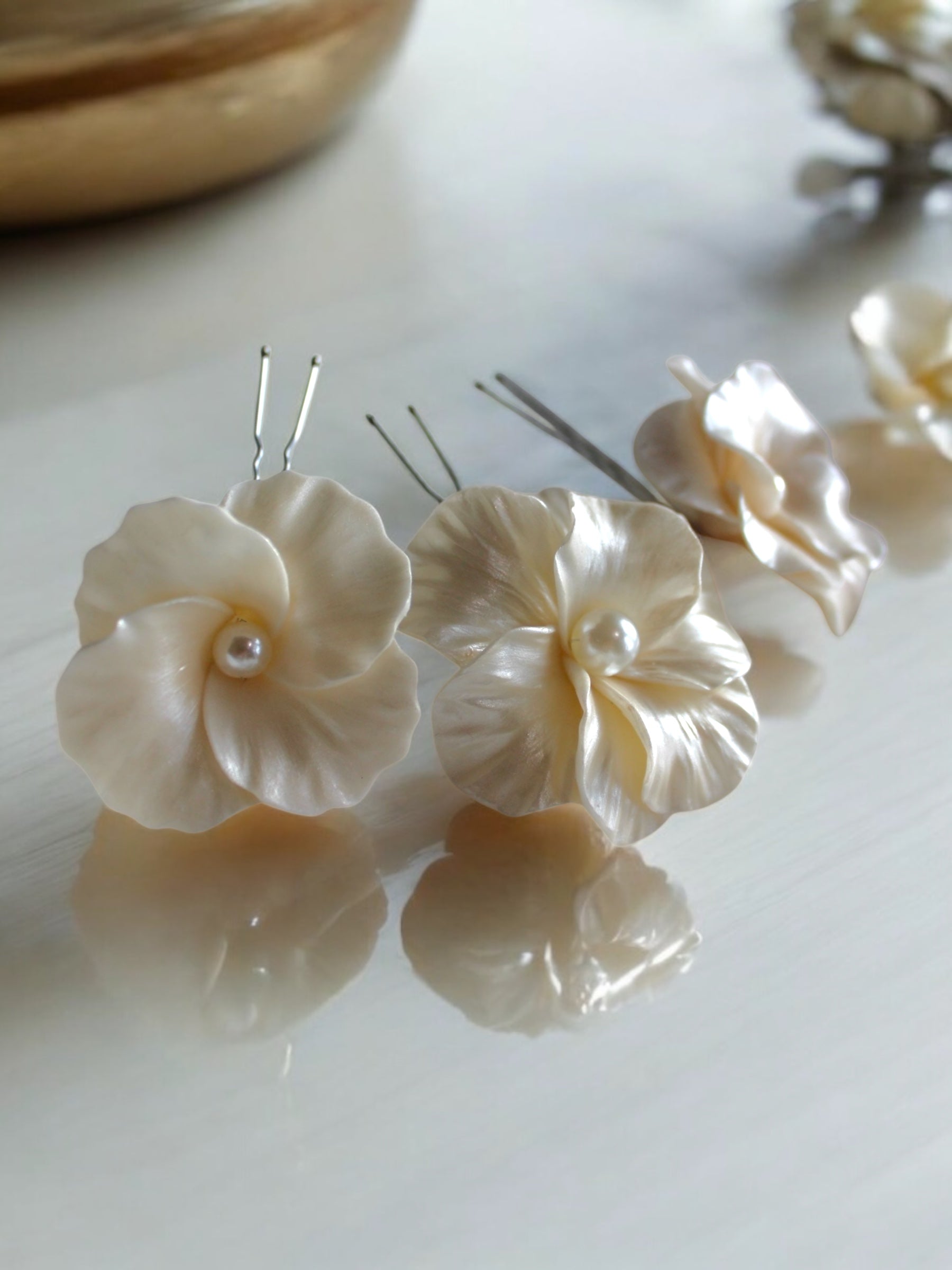 Una interpretación luminosa de la naturaleza. El set Ivory Blossom captura la esencia de un jardín en flor bajo la luz del mediodía. Con su suave tono marfil y brillo radiante, estas tres horquillas fueron creadas para la mujer que busca el equilibrio perfecto entre lo clásico y lo contemporáneo, realzando su peinado con un aura de frescura y sofisticación.
