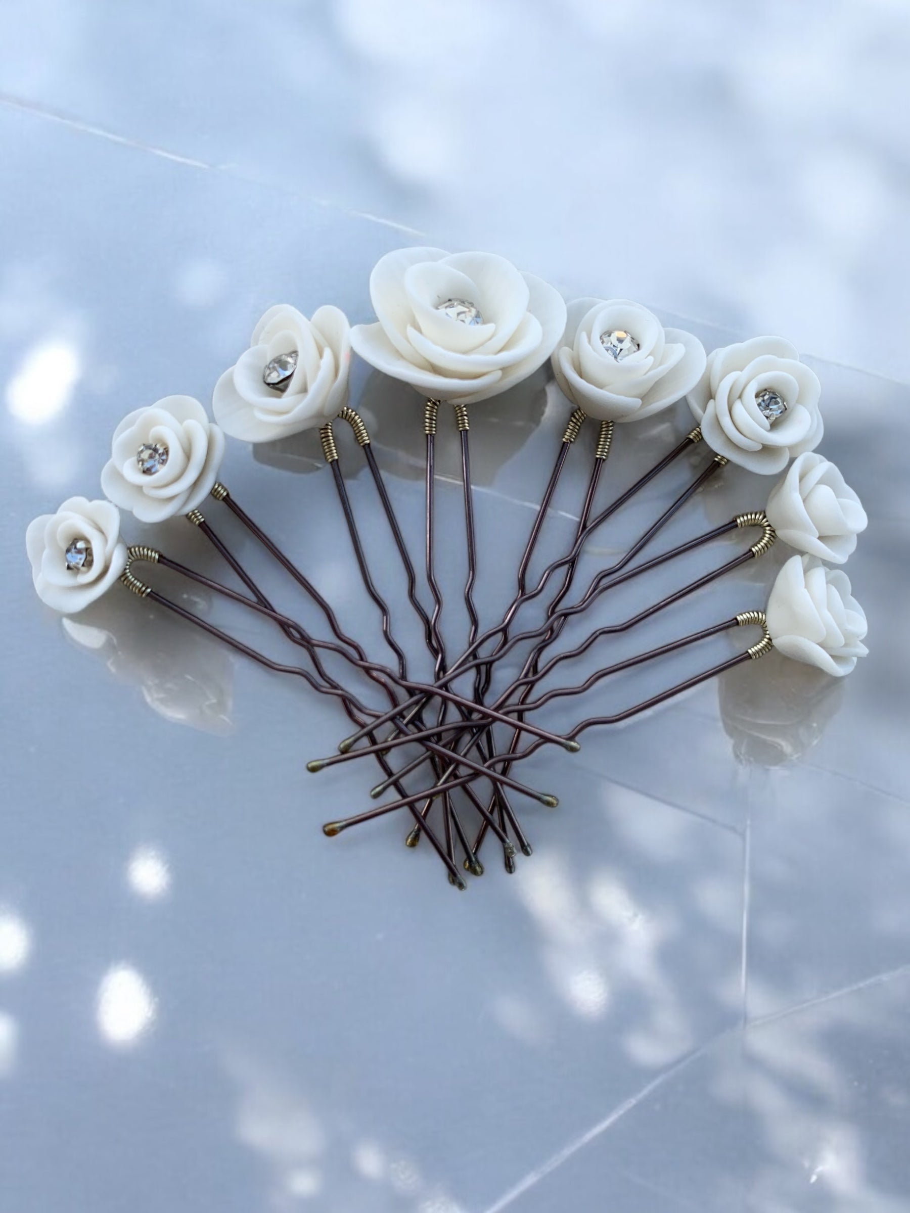 Estas diminutas rosas, con sus centros brillantes, son el detalle perfecto para añadir luz y sofisticación a un peinado, creando un efecto visual a la vez dulce y lujoso.